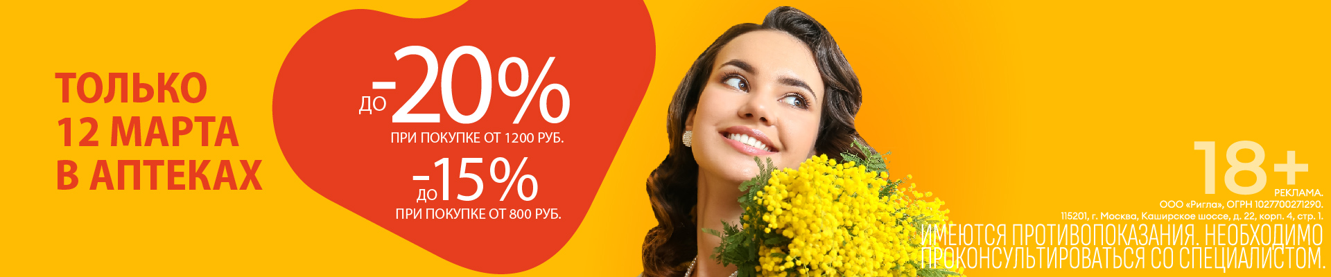 Акция проводится 12 марта 2025 г. в аптеках «Ригла» на территории Новгородской области и Псковской области. Предоставляется скидка до 15% при покупке от 800 рублей и до 20% при покупке от 1200 руб. Скидка распространяется на весь ассортимент, кроме товаров Аллокин-Альфа лиоф. д/р-ра для п/к введ. 1мг №3, Аллокин-Альфа лиоф. д/р-ра для п/к введ. 1мг №6, Аллокин-альфа пор.д/ин. 1мг №3, Аппарат Алмаг магнитотерапевтический, Аджови р-р для п/к введ. 150мг/мл 1,5мл шприц №1, а также товаров по акции «Товар дня» и «Стоп цена». На товары, приобретенные по акции, дополнительные скидки не действуют. Если товар участвует в нескольких акциях со скидками, то применяется наибольшая скидка в рублях. Реклама ООО «Ригла» ИНН 7724211288. Организатор акции – ООО «Аптечная сеть О3», ИНН 7709068298. Организатор акции вправе вносить изменения в условия акции и отменить ее без предварительного уведомления. Подробные условия акции и полный список аптек, участвующих в акции, уточняйте у сотрудников аптек и на сайте www.rigla.ru.